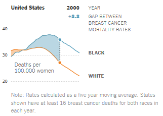The visualization takes a look at women breast cancer in the US. It focuses on the disparities between the mortality rates of black and white women, where a considerable gap persists. The visualization has a little interaction in the sense that a slider let's you explore the years between 1975 and 2010 - I recommend you to try it out.