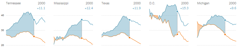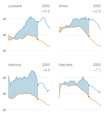 In the small multiples matrix, the states are sorted descendingly after largest gap in 2010 - another little affordance you would expect to find in a good data visualization.