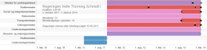 Danish governments are usually constituted by a number of different parties forming a governing coalition. Each government in the visualization has an official title. For instance, the current government is named after the Prime Minister Helle Thorning-Schmidt , who is in her first term in office. However, the title Helle Thorning-Schmidt II refers to the fact, that officially this is the second instance of her government. The original three-party coalition government, Helle Thorning-Schmidt I, fell apart mid-term leaving two parties to reconstitue and carry on.