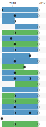 In the visualization, all ministries of the governments are shown in the rows, and the color tells what political party the minister belongs to. The length shows the periods in office; hovering over the bars provides additional information on the minister.